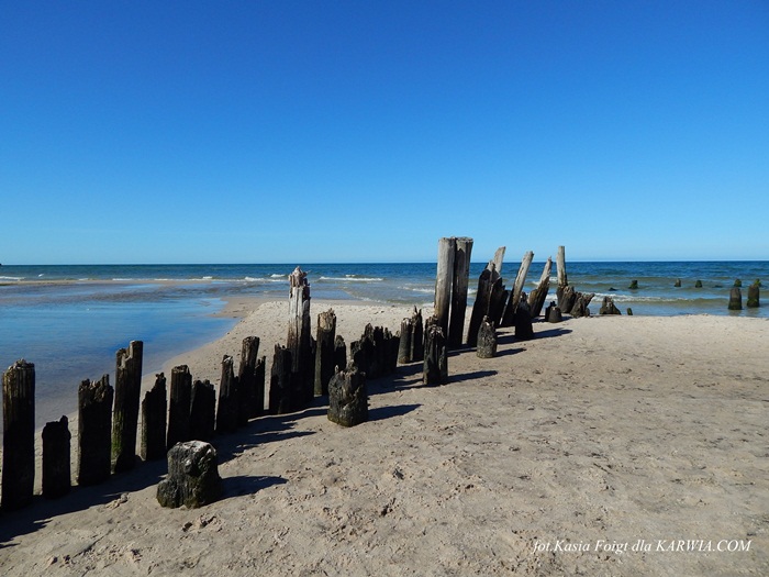 zniszczoną warunkami morskimi drewnianą palisadę chroniącą plażę w Karwi.