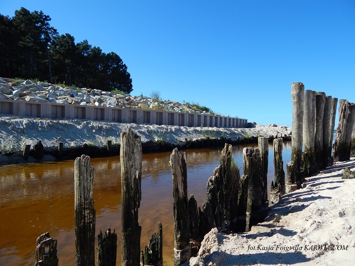 Brzeg Kanału Karwianki zabezpieczają drewniane pale, bliżej morza zauważamy