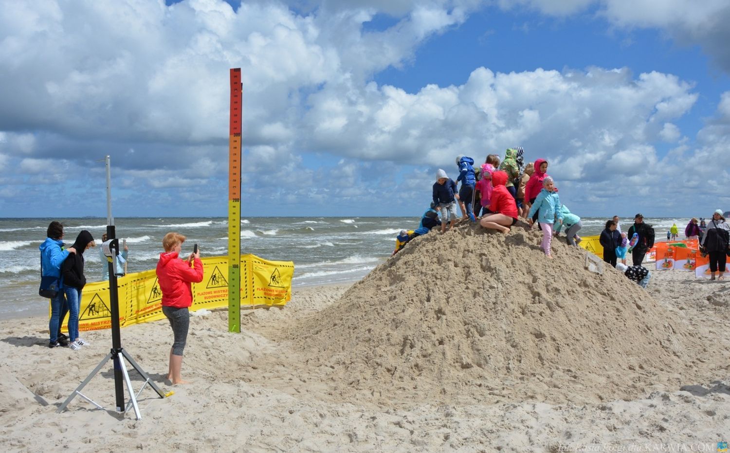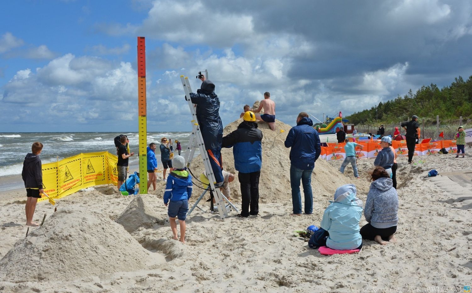 Mimo złych warunków atmosferycznych - silnego wiatru i przelotnego deszczu, budowniczym udało się usypać górę wysokości 268 cm. i ustanowić nowy rekord 2017 - przebili wysokością górę w Kuźnicy o 5 cm.